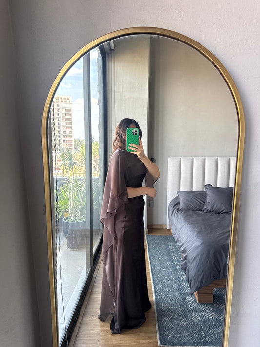Vestido maxi con capa satín café
