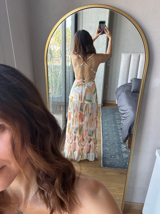 Vestido maxi con capa satín café