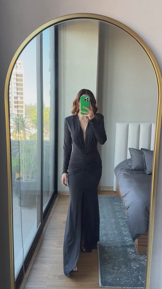 Vestido escote en V maxi manga larga negro