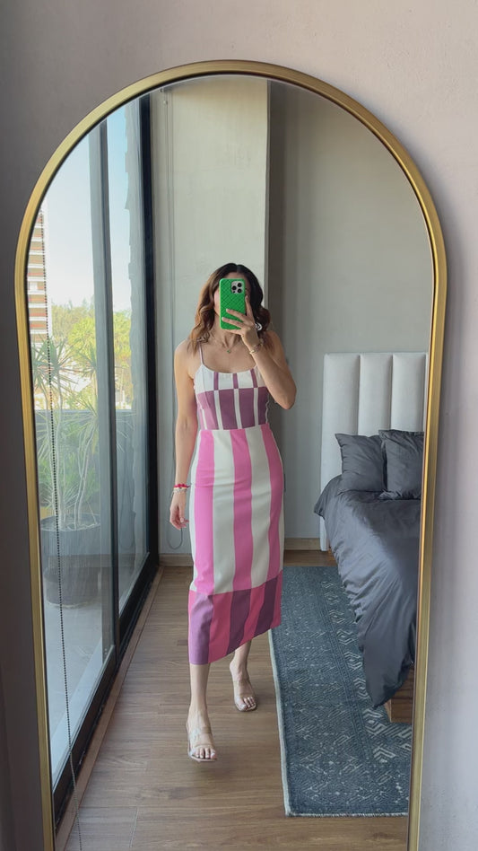 Vestido midi lineas verticales tonos rosas y lilas
