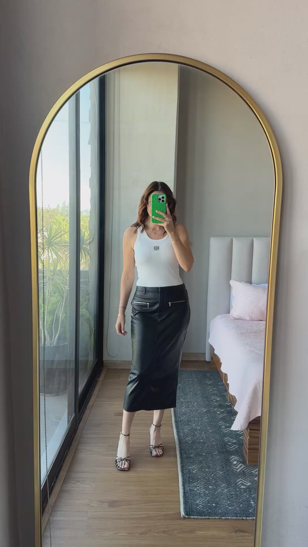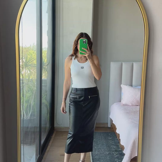 Falda midi tipo piel abertura al frente detalle bolsas con cierres, Color negro