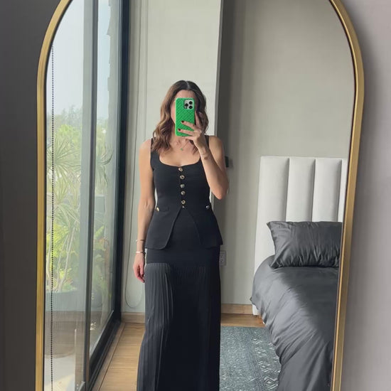 Set blusa con abierta al frente, botones dorados y falda maxi con tul en la parte de abajo, Color negro