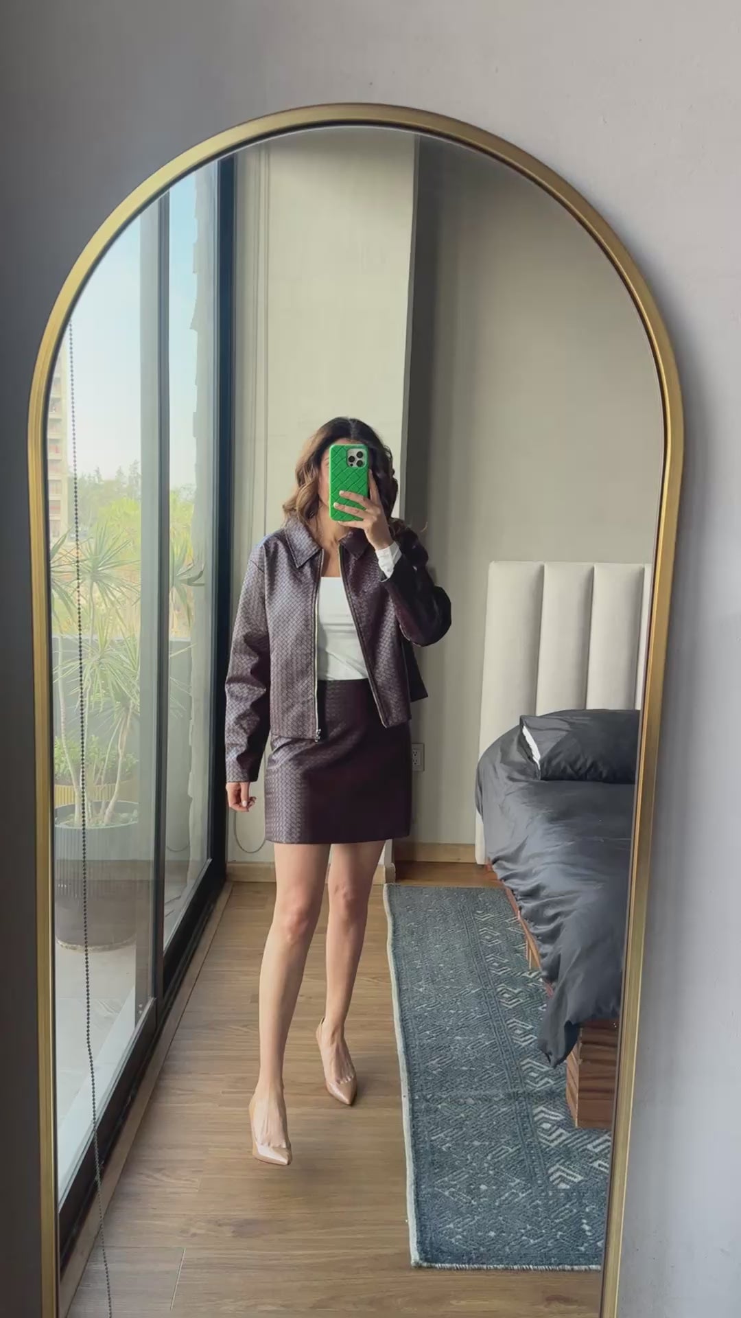Set chamarra y falda mini tipo piel , Color tinto