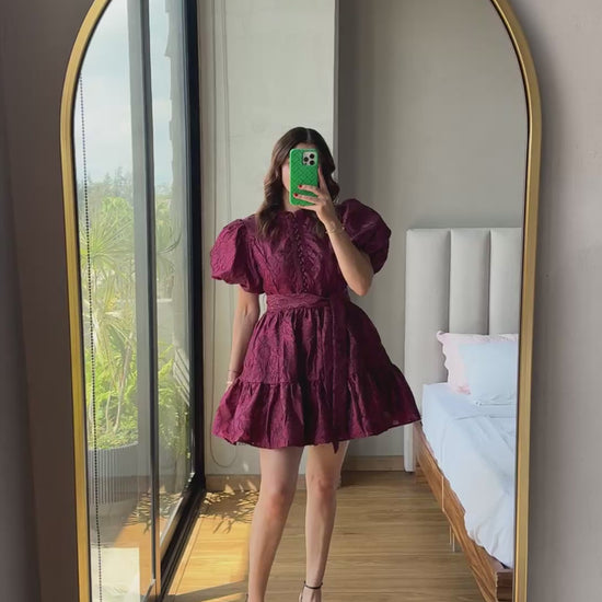 Vestido corto manga bombacha cinturón de listón, detalle botones al frente cierre parte trasera, forro y tul ,Color tinto