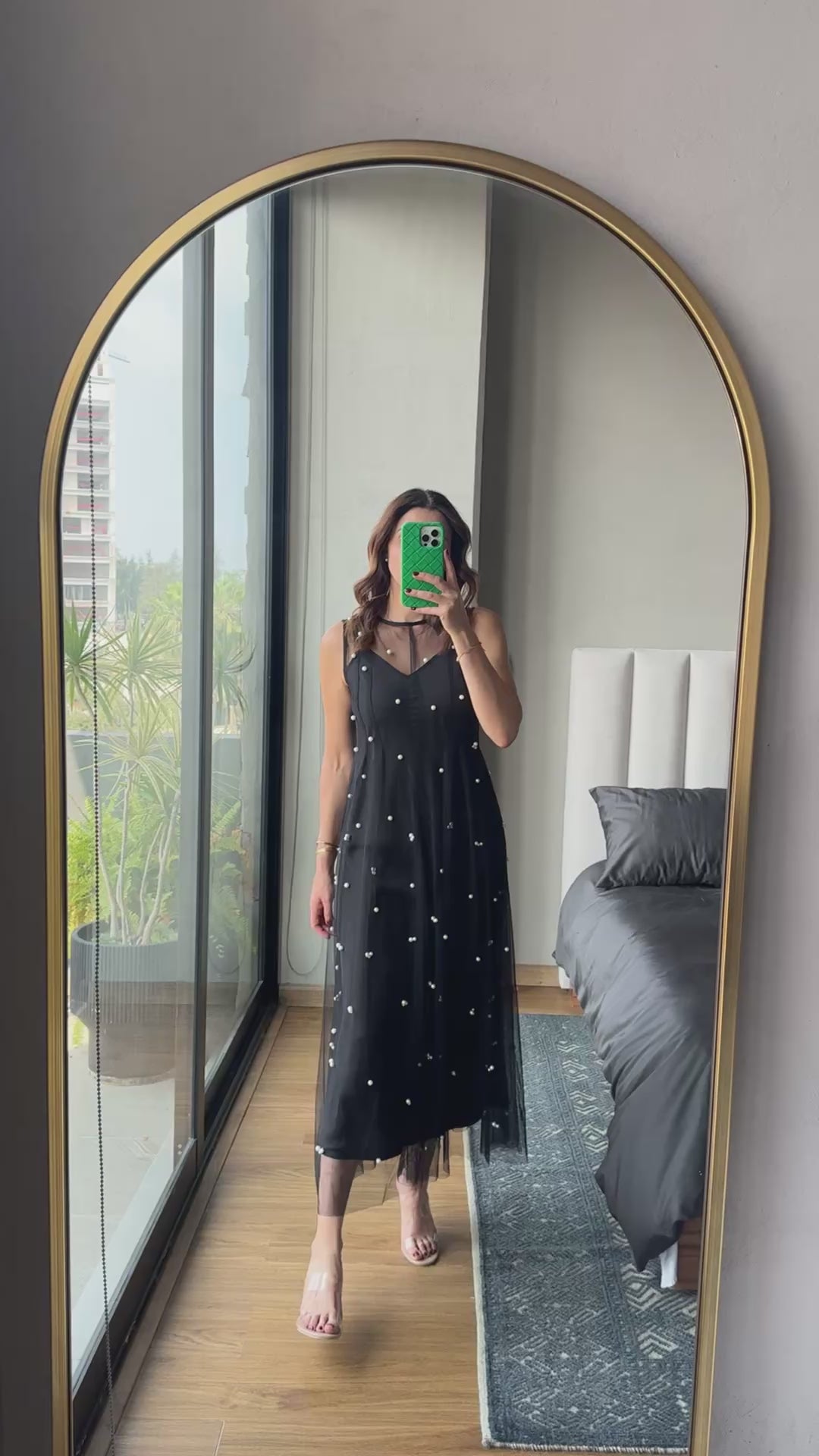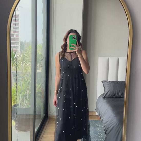 Vestido midi mesh con perlas con fondo detalle espalda, Color negro