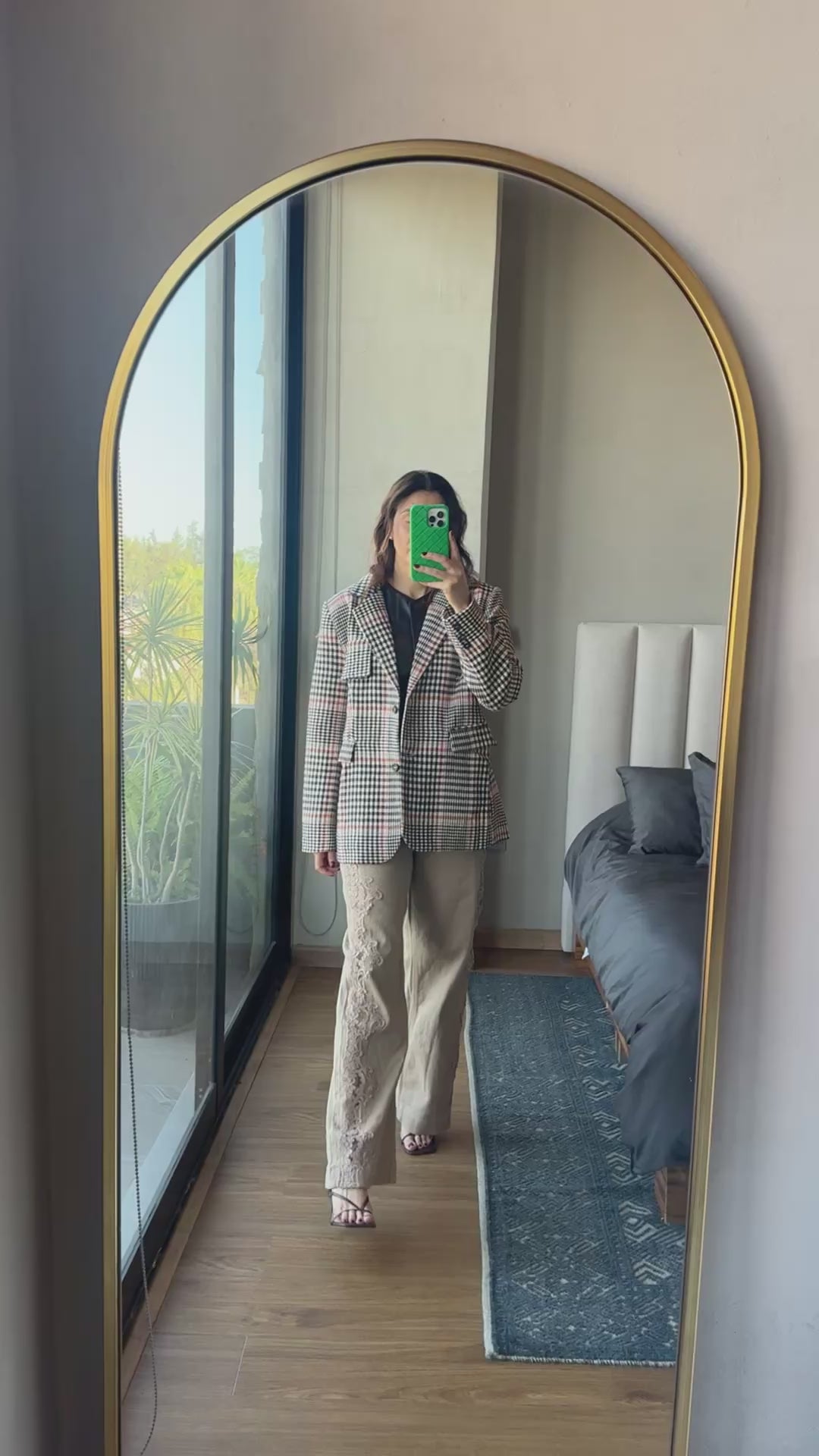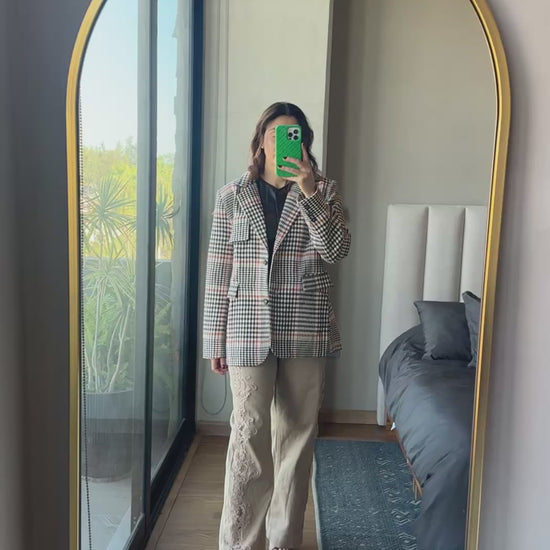 Blazer cuadros detalle bolsas y forro , Color beige café y rojo