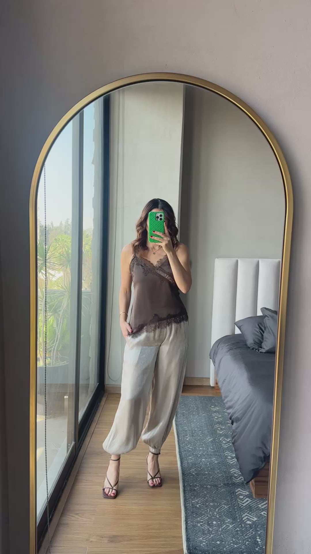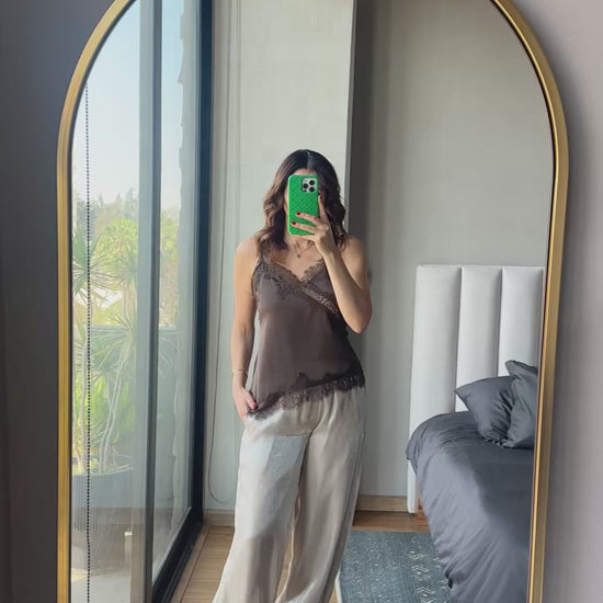 Blusa satín corta con lace café