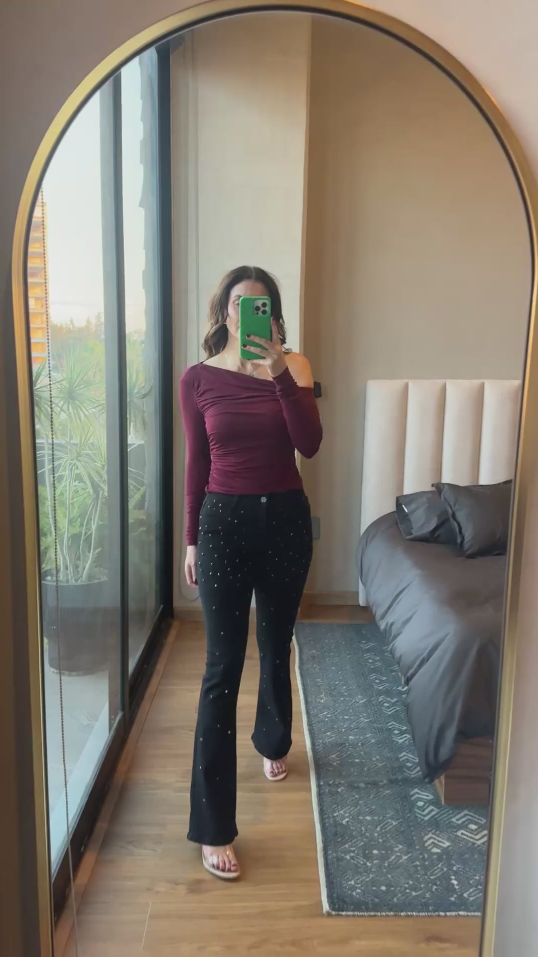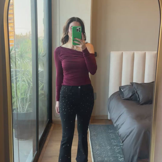 Pantalón acampanado detalle brillos en la parte de al frente, Color negro