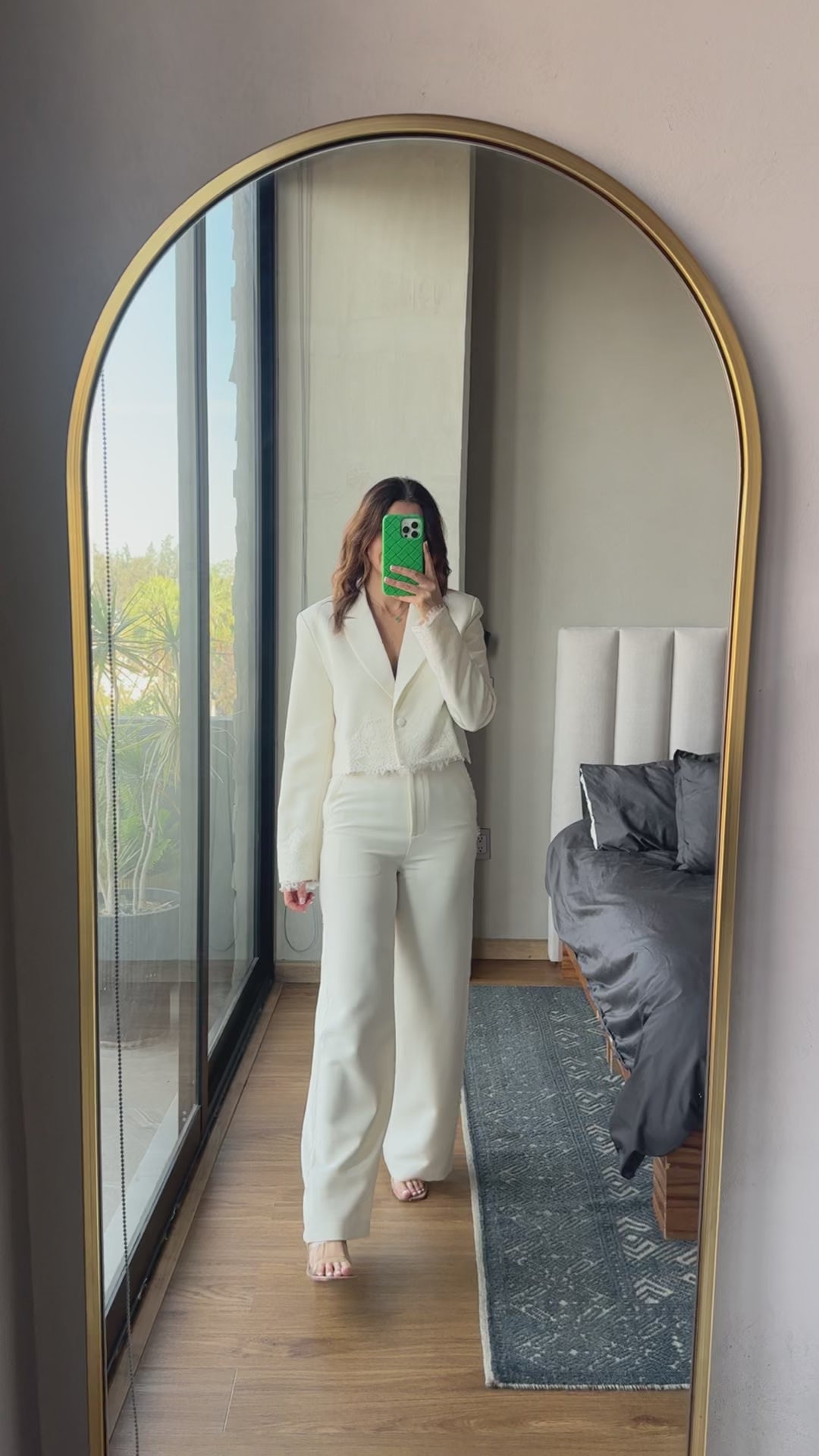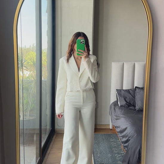 Set blazer corto y pantalón pierna ancha detalle lace, Color crema