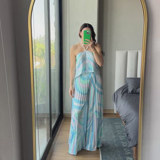Set blusa halter detalle piedras en cuello abierto en espalda y pantalón plisado, Color varios